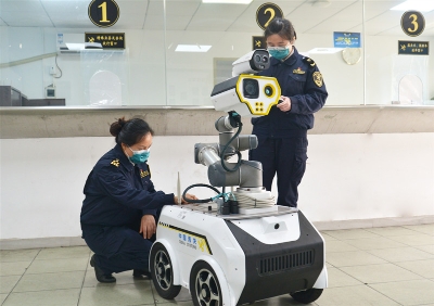 在文锦渡口岸,机器人“安安”在查验台上来回“走动”,对查验区人员开展体温监测,并广播防疫注意事项。