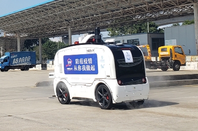 在深圳出口加工区,一辆无人防疫车自动行走在查验场站、园区道路、园区各企业办公楼以及车间等地。这是深圳海关派出的“5G+无人防疫车”,对出口加工区开展智慧消杀以及防疫宣传。