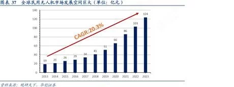 随着无人机技术的不断成熟,民用无人机在日常生活中逐步普及,消费级无人机销售尤其火爆,其主要运用于个人航拍等娱乐行业,并向商业影视拍摄等领域拓展。目前无人机市场销量最大的为消费级无人机,消费级无人机近几年来高速增长,全球市场需求旺盛。根据预测,到2023年为止,全球民用无人机市场规模将从2013年的19亿元发展到124亿元,年均复合增长率将达到20.3%。