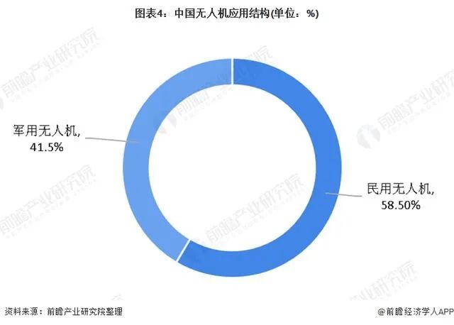 无人机在中国的起步较晚,且开始于中国军用领域。2014年,中国无人机行业贡献度主要以军用无人机为主,贡献率高达90%,而民用领域则仅占10%左右。但民用领域的需求规模在近两年得到较大的释放,截止到目前,我国民用无人机市场规模占比超过军用无人机,达58.5%,未来,行业市场结构仍将不断改变,民用无人机市场将不断扩大。