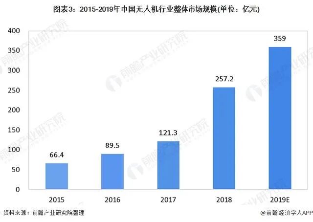 近年来,随着集成制造的普及,无人机基础零部件生产开始迈向小型化、低成本、低能耗方向发展,无人机制造成本不断走低,同时伴随着人工智能、5G通信等新技术的逐步完善应用,无人机行业迎来新的发展机遇,行业在良好的发展环境中迅速增长,行业规模不断扩大。2015年我国无人机行业整体市场规模仅为66.4亿元,2018年无人机行业整体市场规模增长至257.2亿元,年均复合增长率达57.05%。前瞻产业研究院估计,2019年中国无人机行业整体市场规模达359亿元。