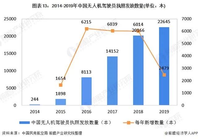 民航局规定无人机用户必须考取驾照才能够合法使用无人机,这使得无人机驾驶员岗位的含金量不断提高。根据中国民航局的统计,截止2019年12月31日,全国拥有无人机驾驶员执照的人数为67218人,其中2016-2018年连续3年,每年新增的无人机驾驶员数量均在6000人以上。