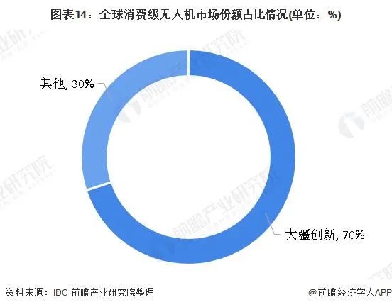 中国的无人机行业的发展特别是民用无人机的发展走在世界前列,根据IDC的数据统计,大疆创新占据着全球消费级无人机市场70%以上的份额,在全球民用无人机企业中排名第一。