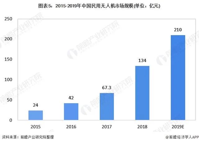 中国民用无人机自2008年汶川地震之后开始在国内兴起,经过几年的发展,当前无人机的应用范围已涉及国土资源调查、环境监测、水情监测、救灾等多个领域。2015-2018年我国民用无人机年均复合增长率达77.4%,2018年我国民用无人机的市场规模134亿元,行业迎来爆发增长。前瞻产业研究院估计,2019年我国民用无人机市场规模达到210亿元,同比增长56.72%。