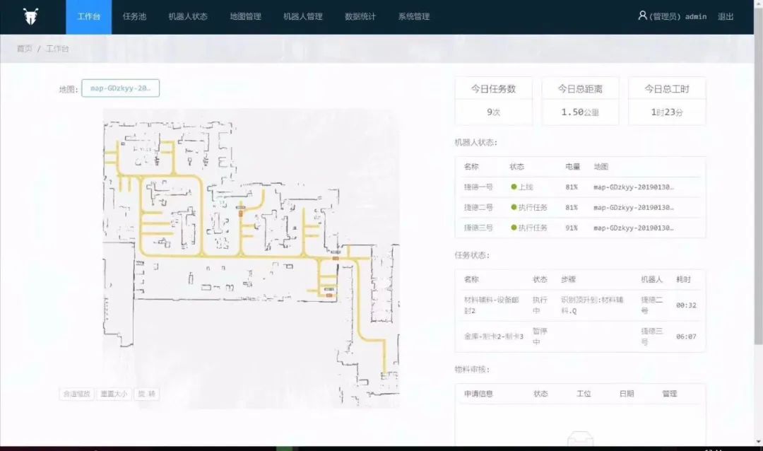 •工时效率统计:用户可以很清晰的看到机器人当天运行的任务数量、运行距离和工作总时长。