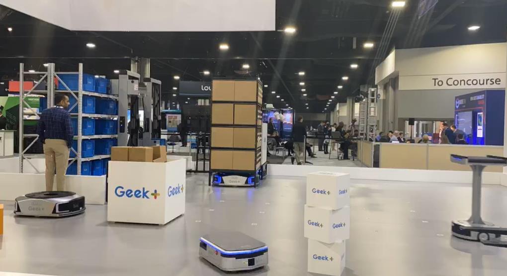 中国AGV网(www.chinaagv.com)3月10日来自美国亚特兰大Modex 2020展消息。来自中国的极智嘉公司Geek +在6696号展台上展示其多系列主打产品。极智嘉去年在加利福尼亚州圣地亚哥设立北美办公室,此次展会中,创新的RoboShuttle货箱到人拣选及S20分拣机器人也是首次亮相北美市场!