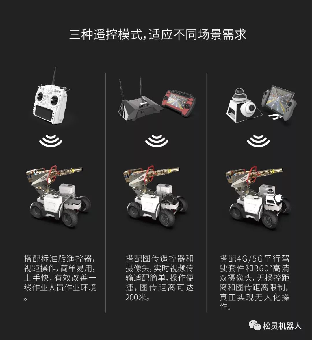 针对消毒机器人,松灵推出三种不同的遥控模式以适应不同场景需求。第一,可搭配标准版遥控器,视距操作,简单易用,上手快,有效改善一线作业人员作业环境。第二,可搭配图传遥控器和摄像头,实时视频传输适配简单,操作便捷,图传距离可达200米。第三,搭配4G/5G平行驾驶套件和360°高清双摄像头,无操控距离和图传距离限制,真正实现无人化操作。可在医院、社区、商场、停车场、办公园区、工业园区等场景使用。