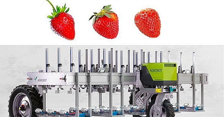 西班牙初创公司Agrobot开发全自动草莓收割机,这种收割机有24条“手臂”,可以独立采摘草莓。Agrobot首先使用机器学习来测量浆果的成熟度。为了保护果实不被挤压或掉落,机器人用两片薄而锋利的刀片把它们从茎上割下来。一旦切好,它们会立刻被装进一个小篮子里,篮子里有橡胶卷,橡胶卷会把水果放在通往包装区的传送带上。