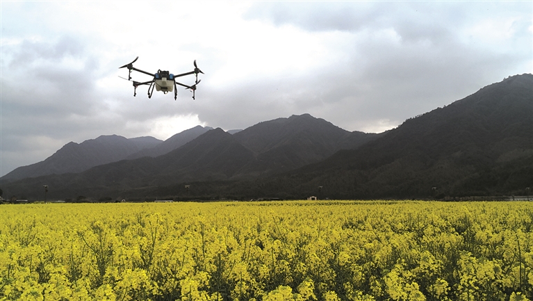 近日,小梅镇首次在黄南畈千亩油菜种植基地使用2台无人机进行精准施肥,实现化肥减量增效,提高化肥利用率。图为无人机在喷洒硼砂,提高油菜结实率和坐果率。记...