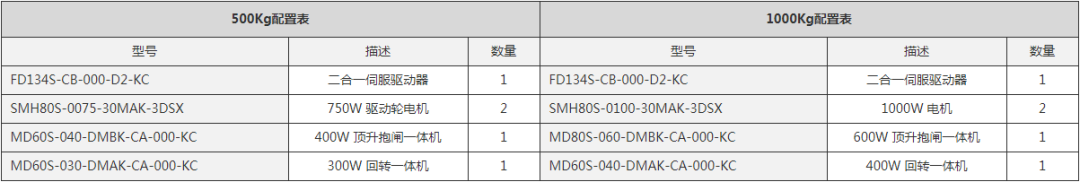 此外,根据客户AGV的载重不同,我们在模块化解决方案的基础上,扩展了500Kg、1000Kg两种不同的载重方案配置,客户可根据不同载重的车型自由选择。