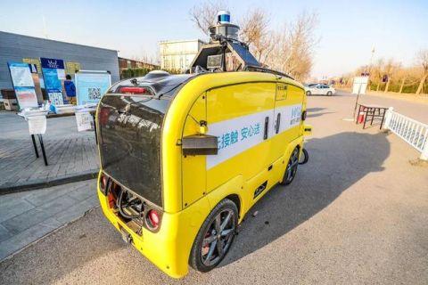 3月16日,在北京顺义区空港街道双龙源社区,一辆无人配送车为居民提供无接触送菜服务。