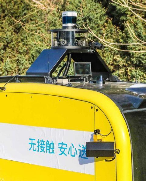 记者现场看到,无人配送车遇到障碍物可自动减速闪避,车身上写有“当日已消毒”字样,一次可运送五六单。在小区内行驶速度大约20公里左右,试运行期间有技术人员跟随维护。