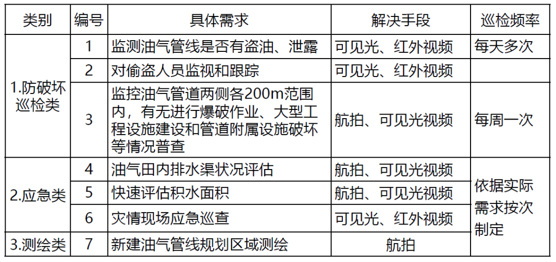 | 偷油 | 监测管线是否有打孔盗油现象; 监测可疑人员和车辆; 侦察、跟踪偷油人员 |