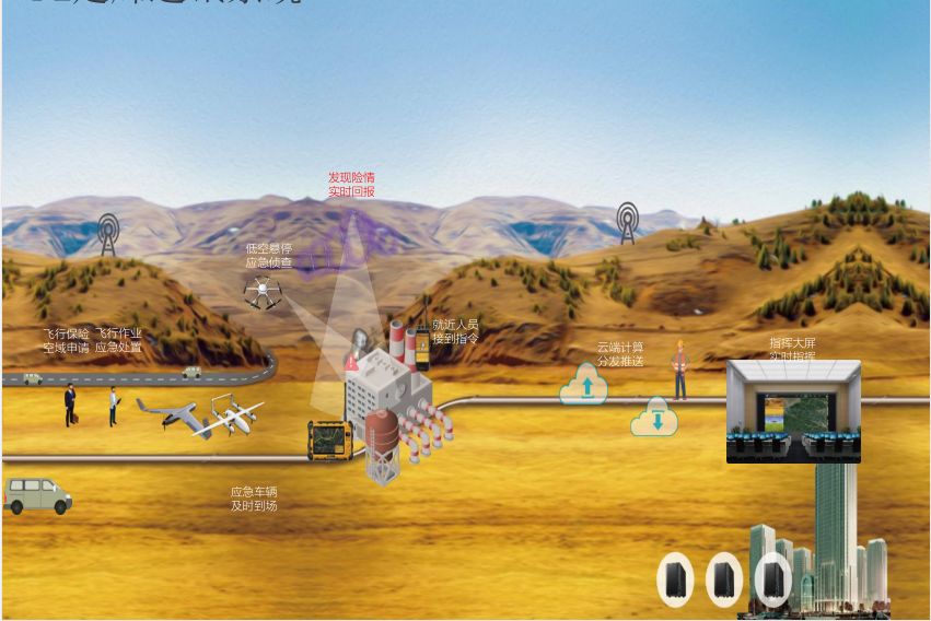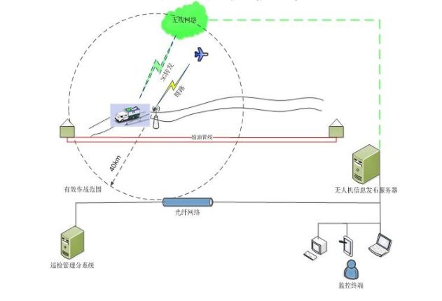 无人机应急应用模式,车辆指挥起飞,针对40km范围内管线进行巡查。