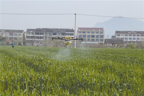 日前,在黄岩区院桥镇前宅粮食功能区内,种粮大户郑永正租用了两架无人机对260亩的小麦进行病虫防治。时下,小麦已进入扬花初期,正是赤霉病等病虫害防控的关键时期。与往年不同,院桥镇的种田“老把式”们在麦田管理中融入了更多的农业科技,采用机器换人,让无人机飞进农田,进行小麦病虫防治。