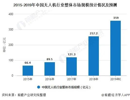 近年来,随着集成制造的普及,无人机基础零部件生产开始迈向小型化、低成本、低能耗方向发展,无人机制造成本不断走低,同时伴随着人工智能、5G通信等新技术的逐步完善应用,无人机行业迎来新的发展机遇,行业在良好的发展环境中迅速增长,行业规模不断扩大。2015年我国无人机行业整体市场规模仅为66.4亿元,2018年无人机行业整体市场规模增长至257.2亿元,年均复合增长率达57.05%。前瞻产业研究院估计,2019年中国无人机行业整体市场规模达359亿元。