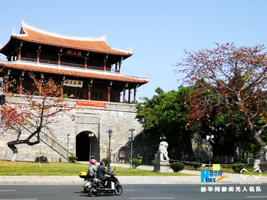从空中俯瞰,泉州古城楼临漳门与周边红花绿植相得益彰(3月16日无人机拍摄)。新华网 王雄 摄 飞手 林楷煜
