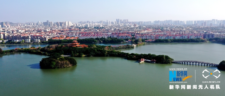 泉州市区的西湖公园春色醉人,湖光山色浑然一体,极具园林之美(3月16日无人机拍摄)。新华网 王雄 摄