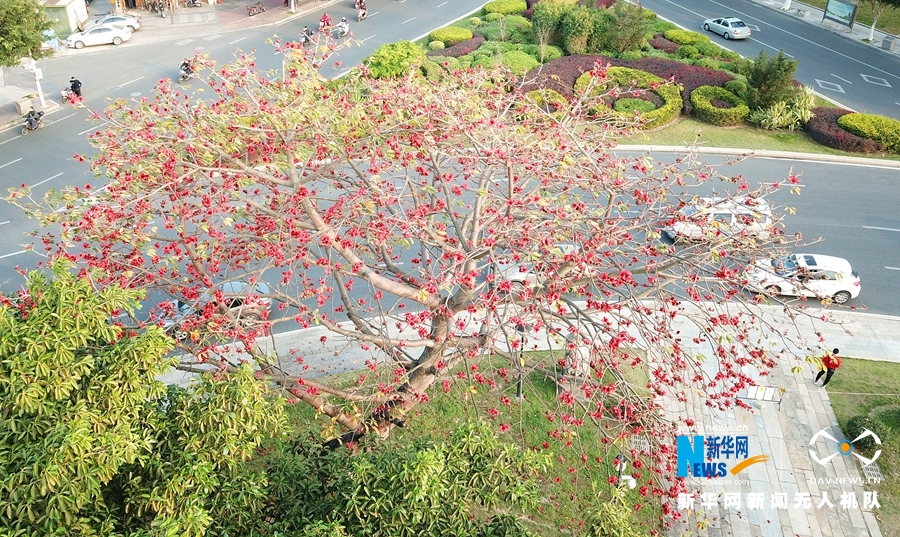 三月的泉州,又见木棉花开,红得像火焰,红得让人心醉(3月16日无人机拍摄)。新华网 王雄 摄 飞手 林楷煜
