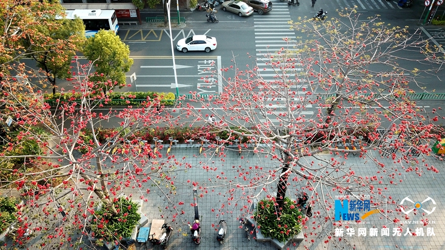 泉州市区涂门街,木棉花开正艳(3月16日无人机拍摄)。新华网 王雄 摄