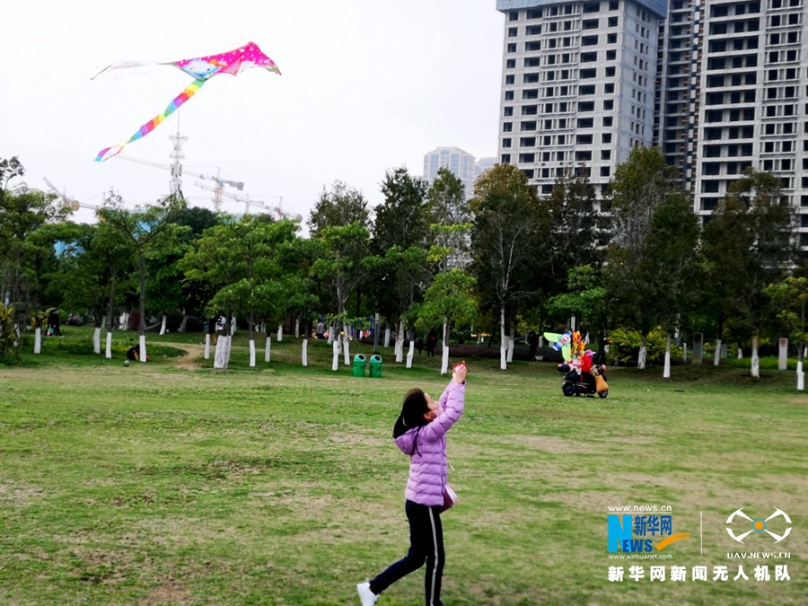 阳春三月,春色醉人,一名儿童在泉州滨海公园放风筝。新华网 王雄 摄
