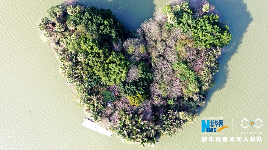 泉州市区的西湖公园心形小岛上绿树幽幽,春意浓(3月16日无人机拍摄)。