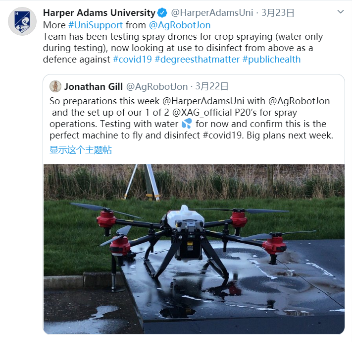 早前,哈珀•亚当斯大学在社交媒体推特 (Twitter)上发布了无人机消杀防疫项目的最新进展。项目负责人Jonathan Gill使用中国极飞科技(XAG)的无人机进行飞行喷洒测试。结果显示,无人机是高效精准消杀作业的理想智能设备。