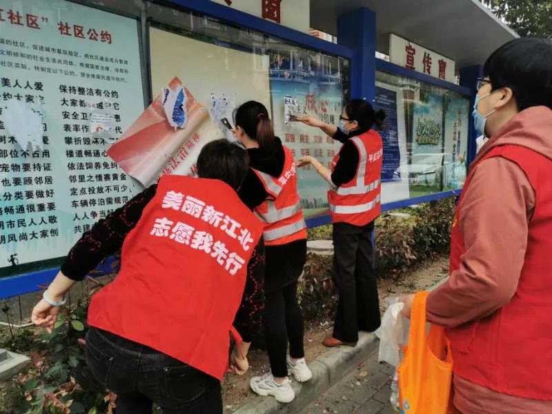 江北区孔浦街道怡家人志愿者团队的20名志愿者,对过期公益广告做了更新,对社区卫生死角进行清理。