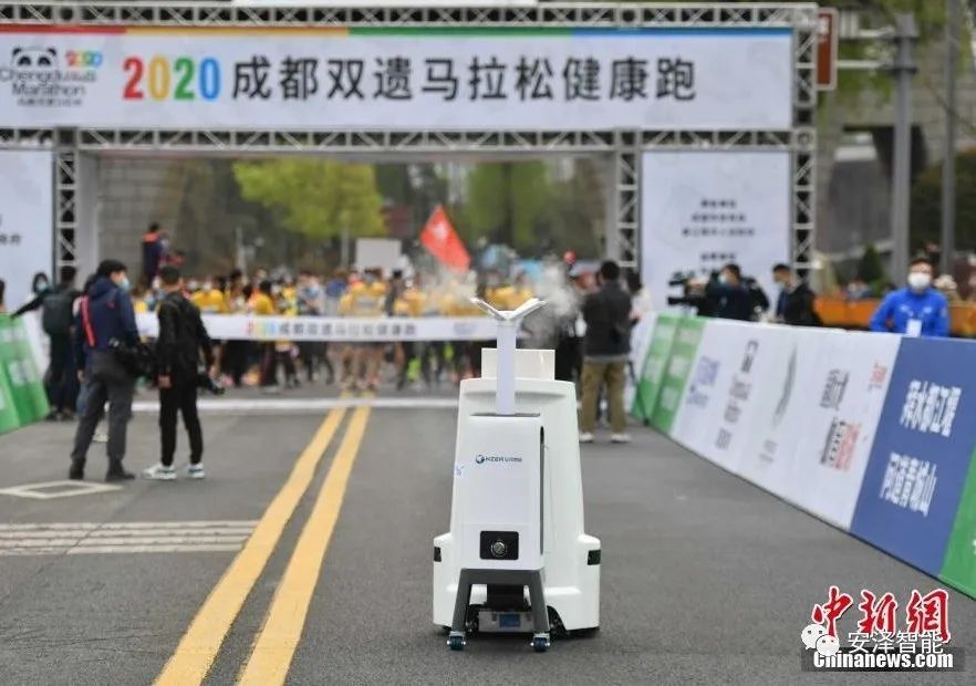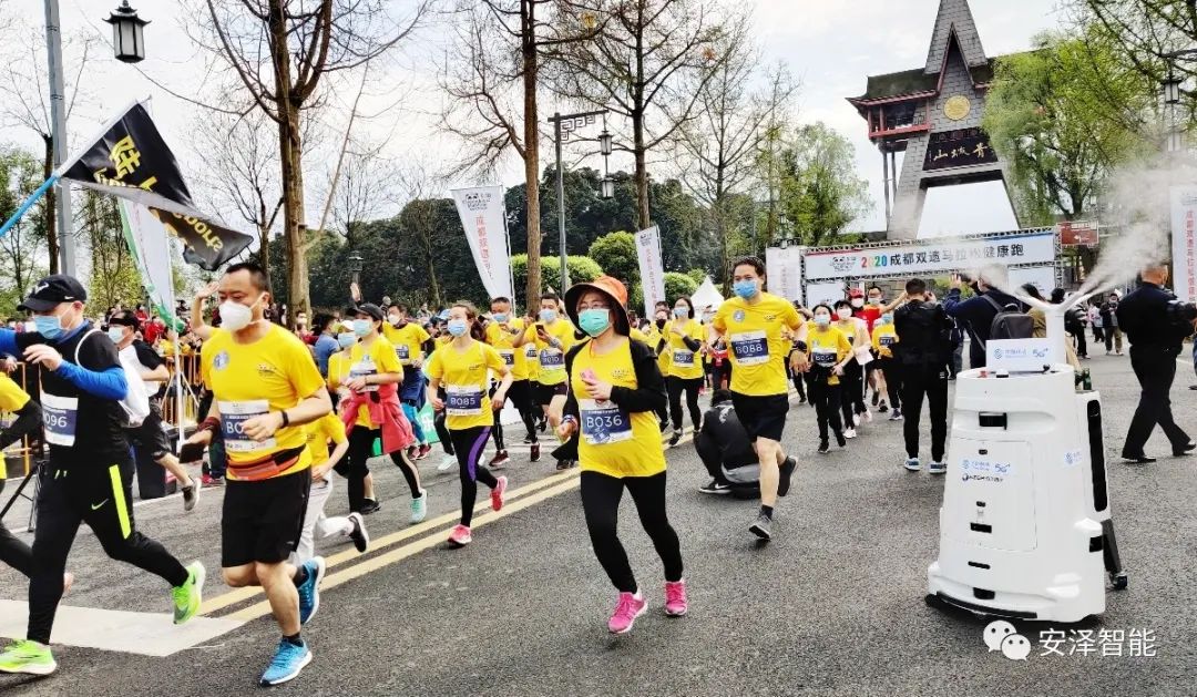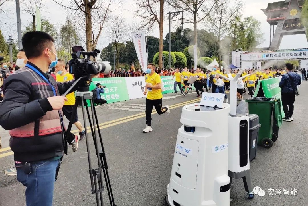 比赛开始之前,一台身上印有“中国移动5G”及“安泽智能”字样的机器人就在起跑点来回“转悠”,对起跑点的各个区域进行消毒,这一行为引起了不少人的注意。