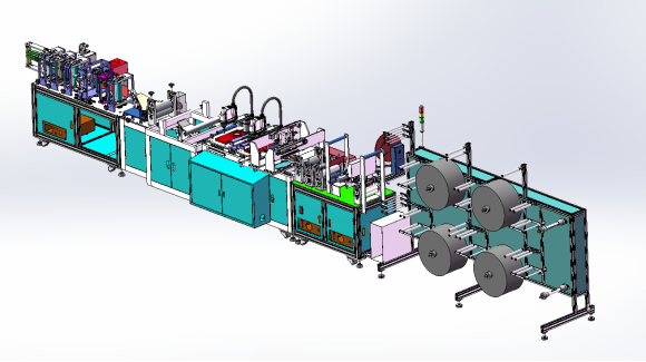 高洁净全自动折叠口罩生产线(KB618002A)适用于高洁净要求的KN95/N95折叠口罩的生产制造,包含工序为自动成型、自动印刷、埋鼻梁条、折叠成型和耳带焊接;设备使用洁净环境使用的伺服系统实现精密送料,滚切模具自动成型,可根据需求使用视觉检测,确保产品质量,同时根据产品调整模具,适用于不同款式的产品(儿童成人定制)。