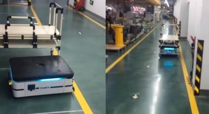 在用户的生产车间内,迦智EMMA400接收到用料需求后,自主行驶到原料仓取货,将校验无误的物料运送到指定产线上料工位;生产线加工完后,EMMA400根据新的指令需求,将物料运输至下一道工序;直到最后的“包装”完工后,EMMA400再根据入库请求将货物自动运送至入库的下料工位。执行每道任务过程中,EMMA400都会将自身的状态信息和执行情况及时反馈给调度控制系统,进行统一智能调度。同时在行驶过程中,EMMA400通过无线io模块实现调度系统与厂区自动门的控制器通讯,进出多道自动门,进行物料的柔性搬运。而当任务完成后,EMMA400会自动返回休息点待命或进入充电区域进行充电,全程无需人工参与。
