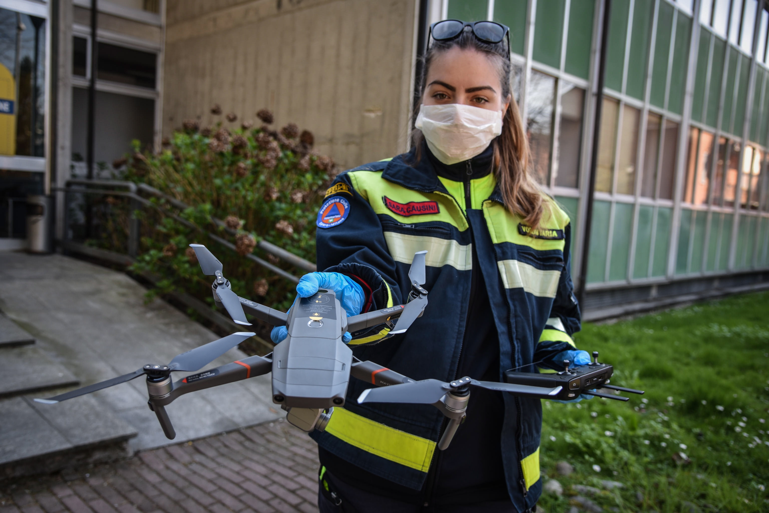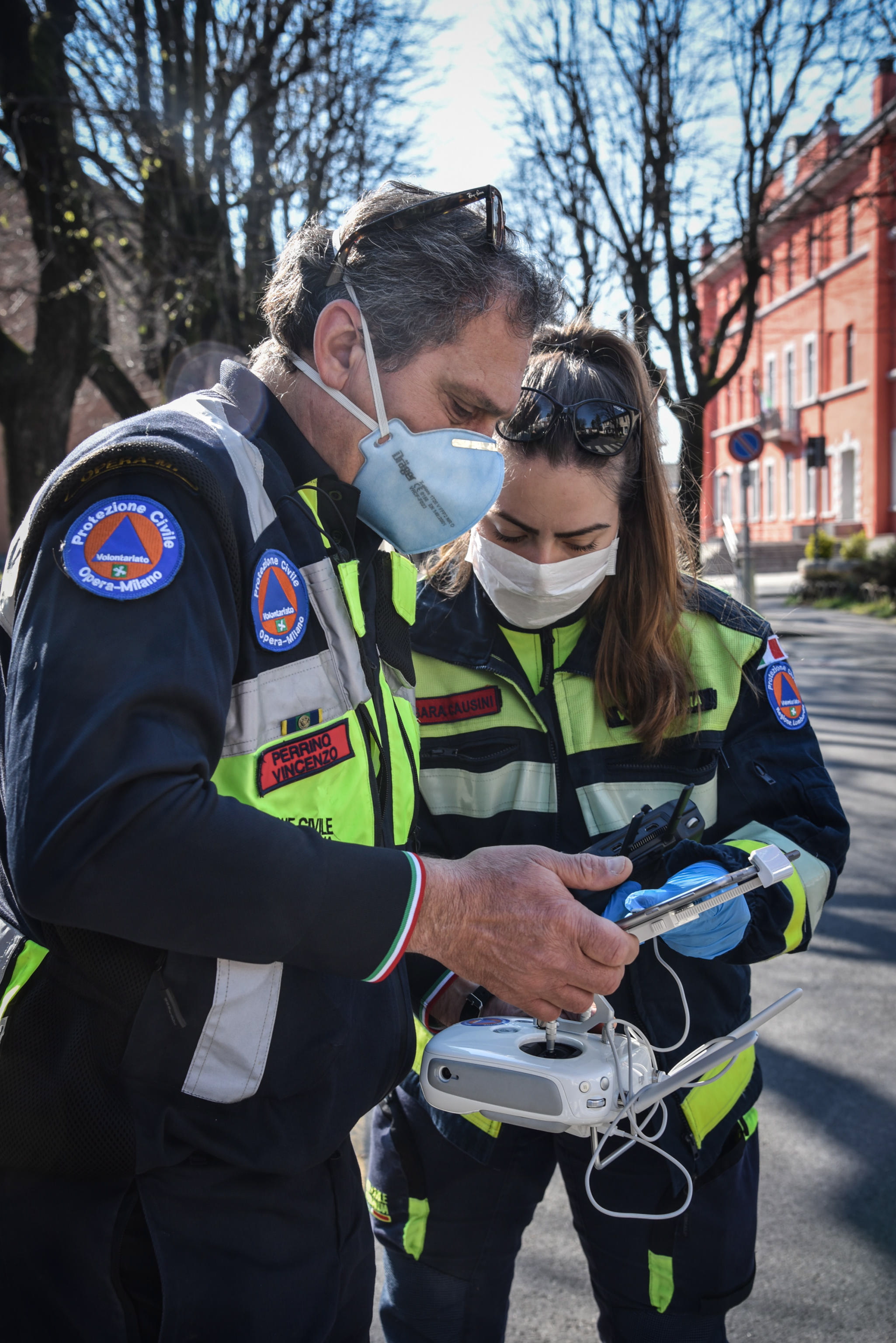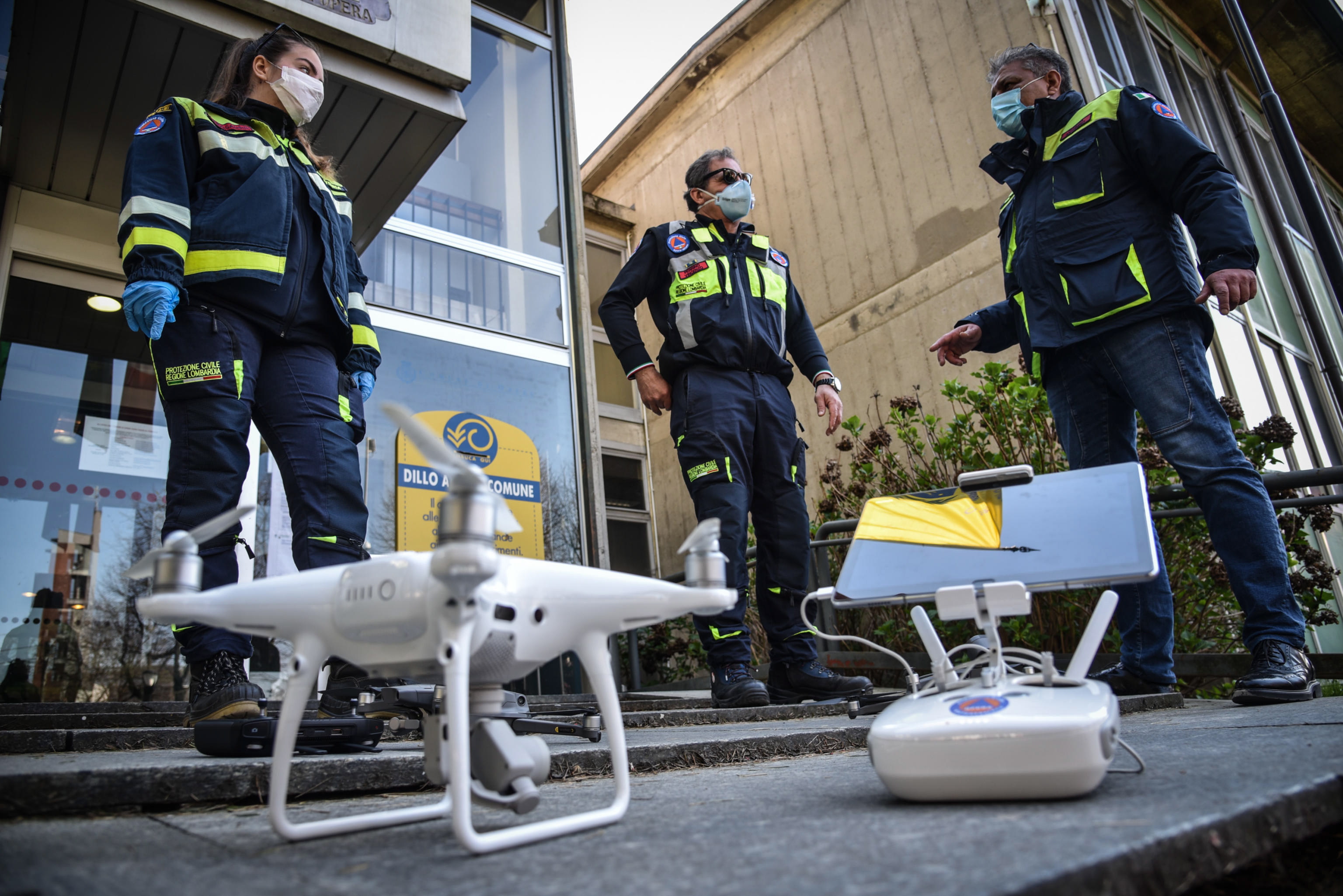 3月24日,在意大利米兰附近,民防部门工作人员展示分发的无人机。