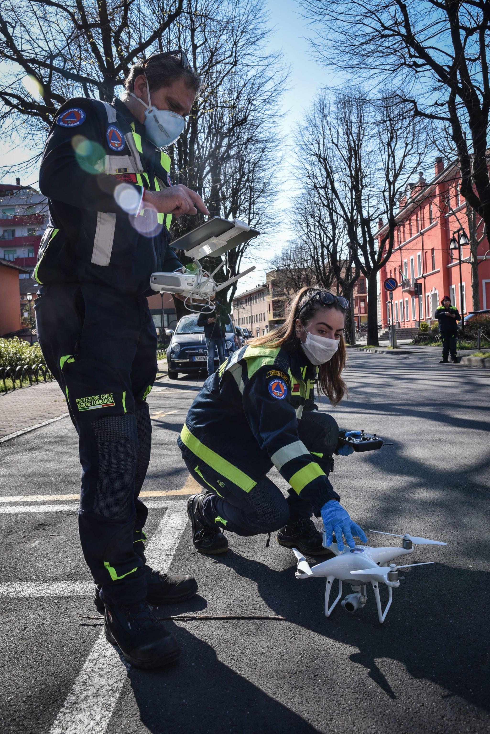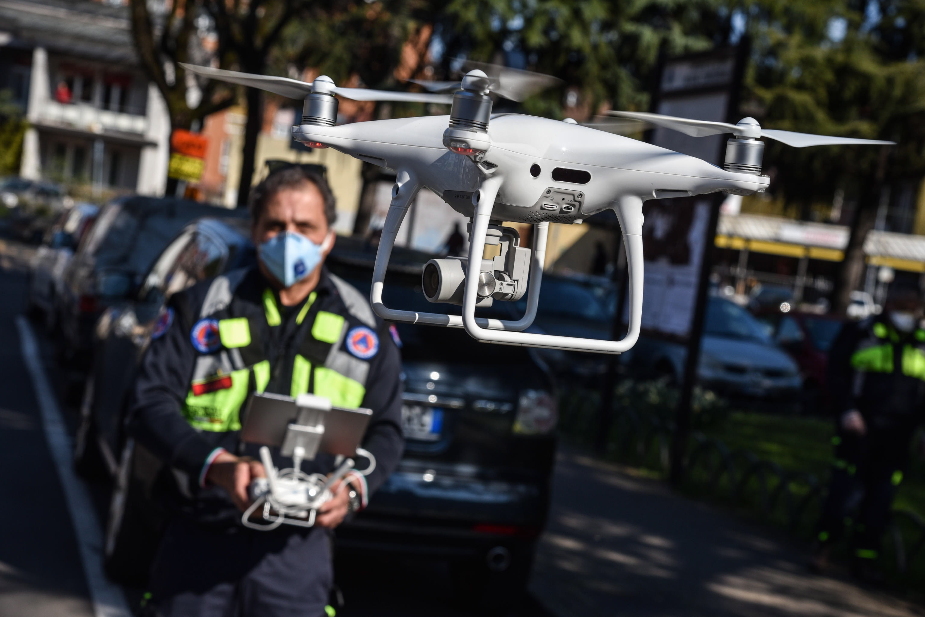 3月24日,在意大利米兰附近,民防部门工作人员使用无人机察看“封城”情况。