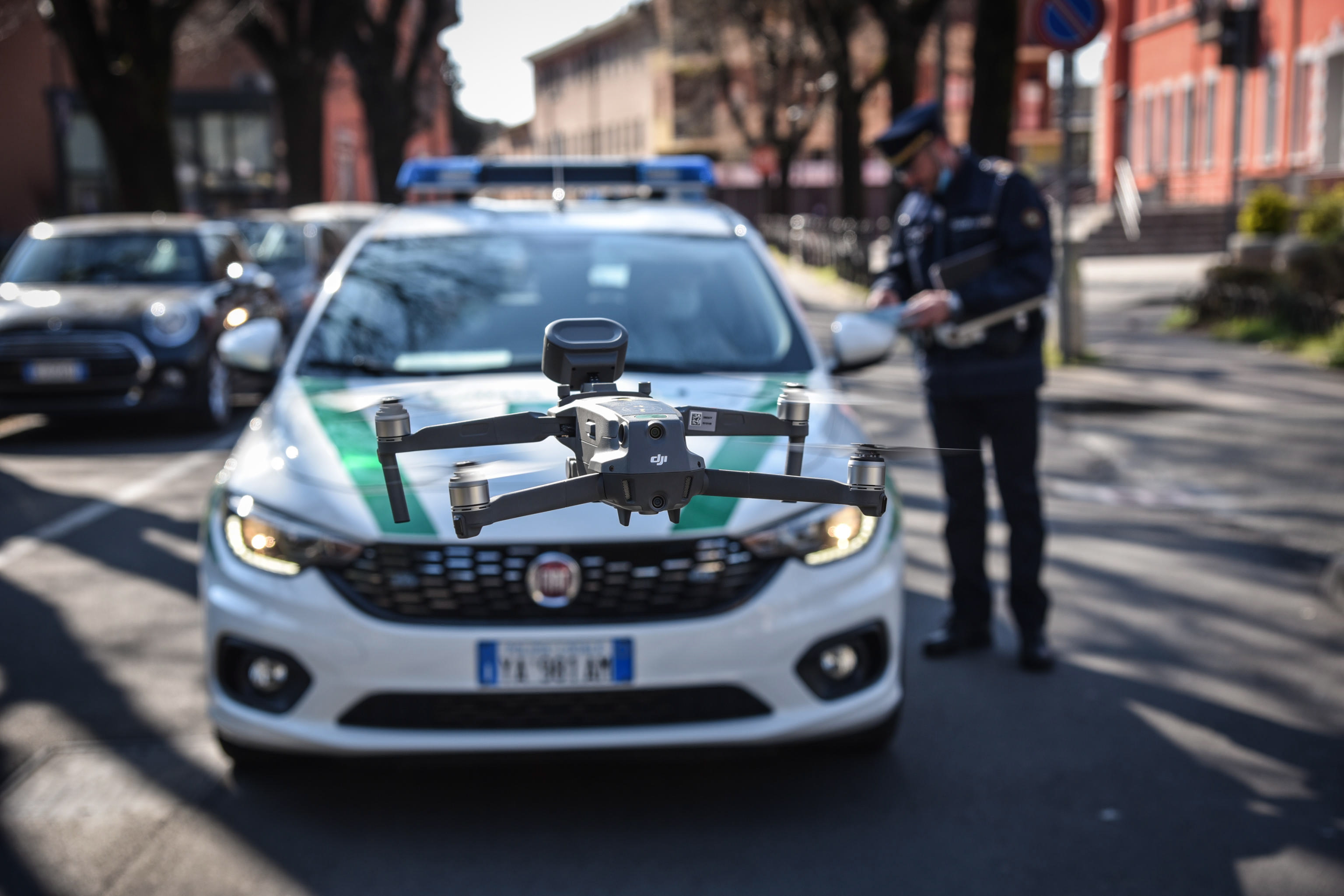 3月24日,在意大利米兰附近,一架察看“封城”情况的无人机飞在警车旁。
