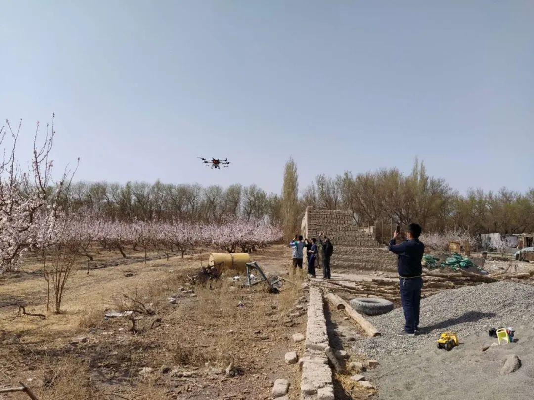 3月26日,在托克逊县郭勒布依乡奥依曼布拉克村村民买买提·艾尼苏力家的50亩杏园上空,一架无人机正在喷洒着花粉,附近村民闻讯赶来,向农业技术专家面对面请教授粉技术。