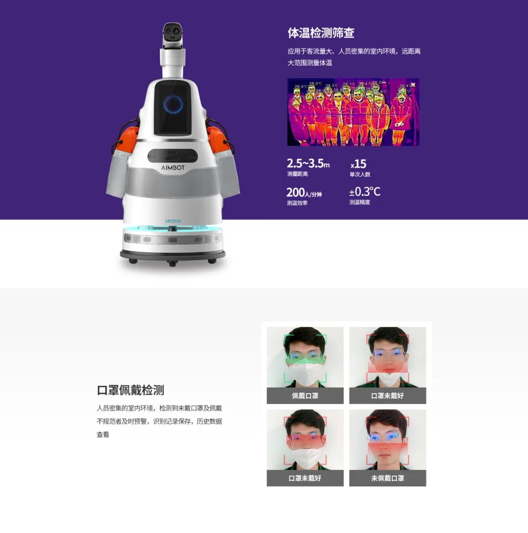经过多位专家严格评审和筛选,优必选科技的两款防疫机器人——室内测温巡检机器人AIMBOT(智巡士)和咨询测温机器人CRUZR(克鲁泽)入选,让我们来认识一下它们。