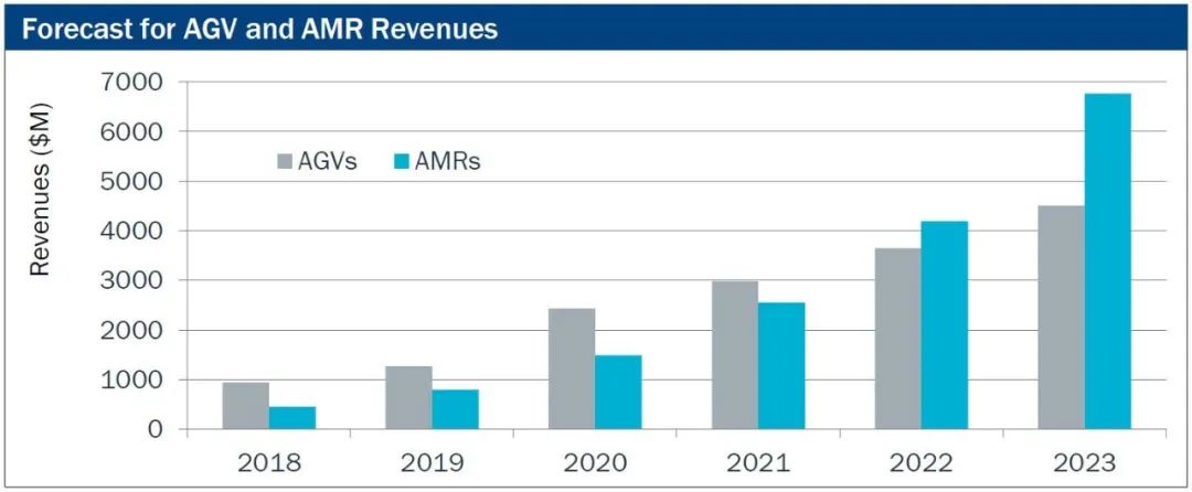 于是,可显著提升搬运效率同时降低人工成本的机器人迅速发展,其中又以AMR自主移动机器人的智能度最高、最具柔性能力,成为了人工智能在产业垂直落地的风口。据Interact Analysis数据,2023年全球AMR市场将爆发至70亿美元。