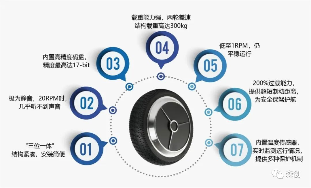 北京和利时电机公司率先推出的伺服电动轮直接替代原有的电机+减速器+轮子的结构,极简化设计,使性能与实用相结合,大大节省了空间,使电机就是轮子,轮子就是电机,跟以往机器人全向轮相比有更大的改进。