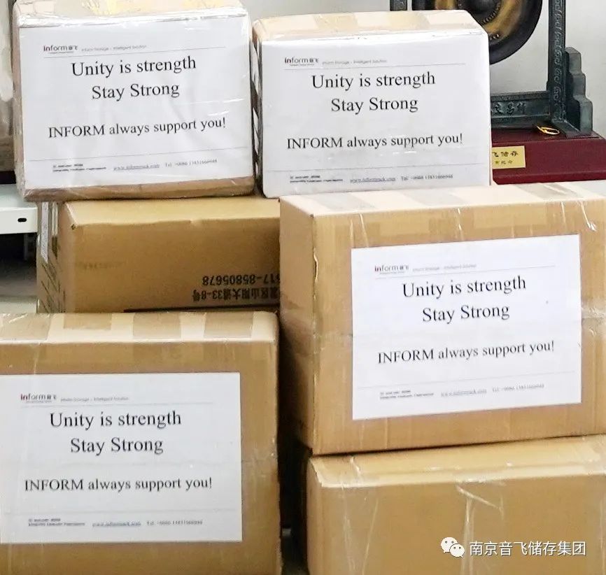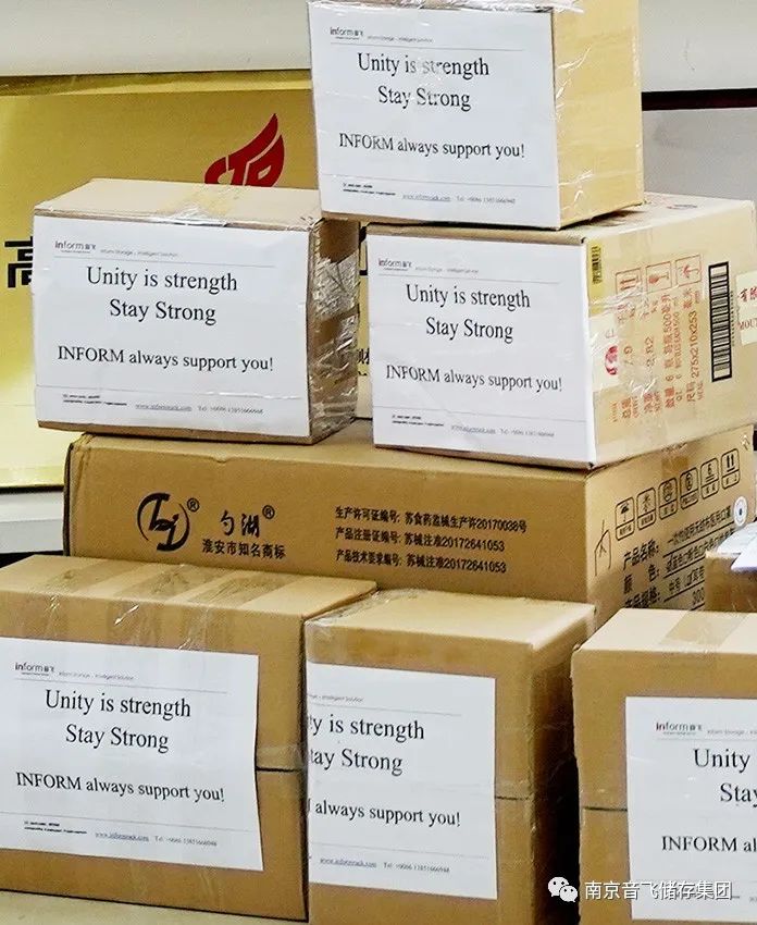 南京音飞集团共筹购了数万只医用口罩及部分额温枪,均已打包完毕,将捐赠给印尼,菲律宾,泰国,意大利、新加坡,沙特,乌拉圭,巴拉圭,哥伦比亚,英国,墨西哥,科威特,毛里求斯,厄瓜多尔等国家。在打包盒上,还附上了暖心的标语:“Unity is strength Stay Strong INFORM always support you(团结就是力量,音飞永远支持你)”,该批物资将陆续发出,驰援到公司多国海外客户及合作伙伴手中。