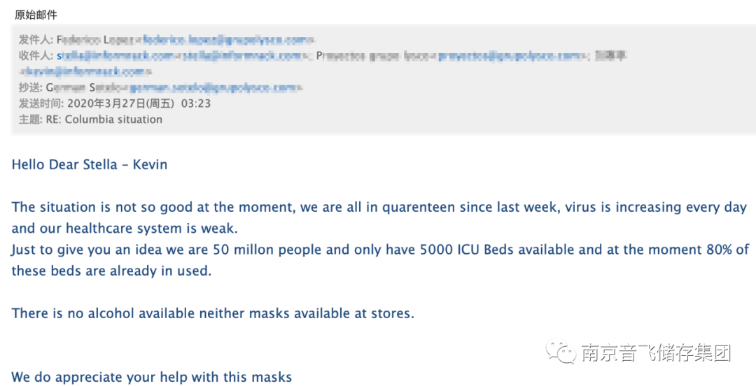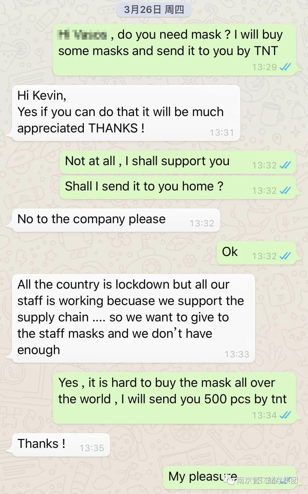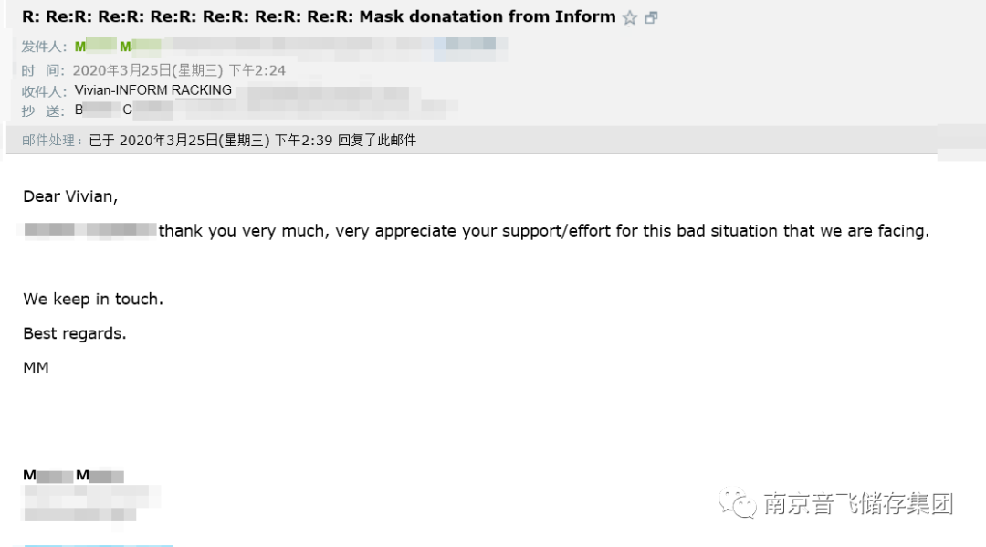 近期,南京音飞集团还收到了来自海外客户的感谢信,感谢南京音飞集团在疫情防控中赠送口罩支援抗疫,以下是部分海外客户来信摘录内容: