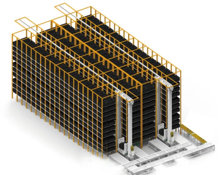 由立体货架、有轨巷道堆垛机、出入库输送机系统、辅助设备、载具、作业控制软件系统(WCS)等组成。