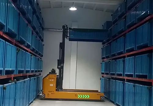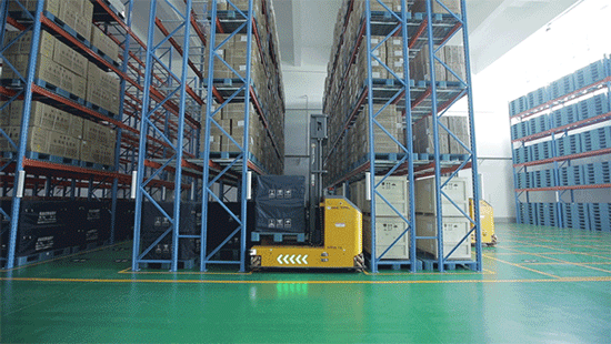 二、成都某客户智能前移叉车物料搬运自动出入库项目:其设备用于仓库箱装物料的进出货搬运,可实现在自动模式下控制全向自动运行托盘,满足将托盘自动化运输到多层货架库位上,实现自动入库、出库的工作流程,避免人员反复进入仓库,节省时间,提高效率。