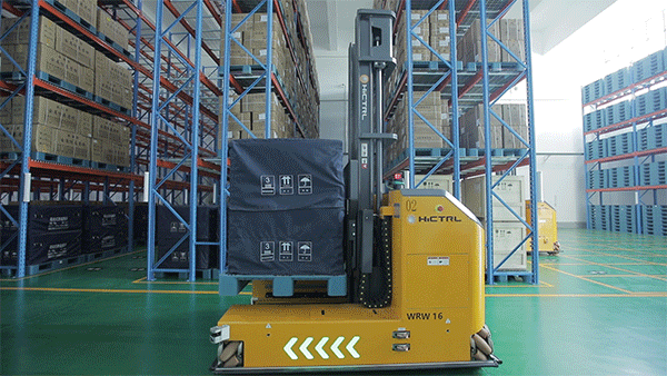四、武汉某客户智能全向叉车仓储物料输送项目:货物托盘转运上货架,使用WMS调度系统,前移叉车根据指令通过规划好的路径运送托盘放入指定货架,实现货物自动出入库, 改变人工搬运的繁琐,安全可靠,避免人员频繁进出仓库对成品造成不必要的损失。