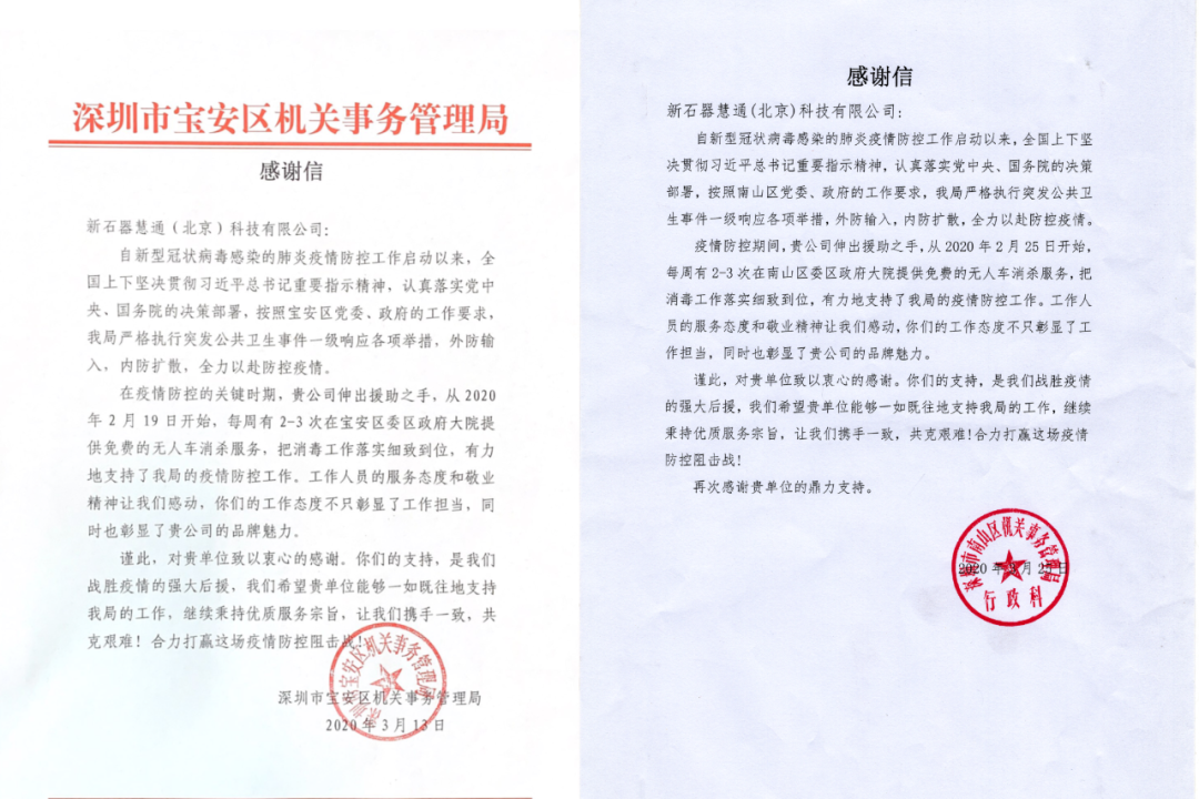 新冠肺炎疫情暴发以来,新石器AI无人车义无反顾扛起责任与担当。在深圳各地为政府及企业提供无人防疫服务,消杀防疫、防疫宣传,守护深圳人民的生命安全。在全国新冠肺炎疫情防控形势持续向好,各地生产、生活秩序加快恢复的时刻,新石器收到深圳政府部门与企业发来感谢信。