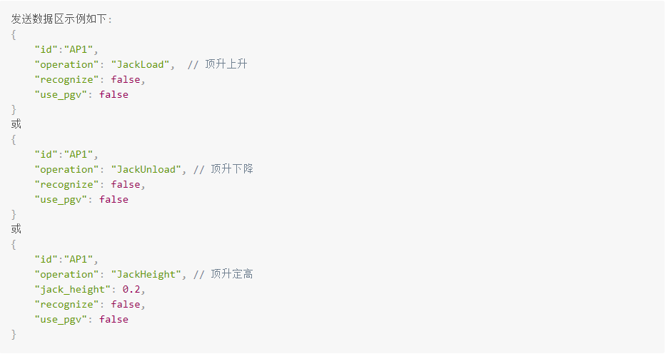 operation:动作可以为 "JackLoad" 或 "JackUnload" 或 "JackHeight"