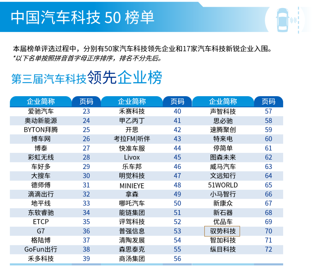毕马威中国领先汽车科技50 榜单于2017年设立,自首次发布以来,就获得了行业内的高度认可,并在汽车科技领域建立了广泛影响力。此次榜单评选,由来自多个领域的50多名专家委员组成评审委员会,通过案头调研、实地访谈、专家访谈以及数据模型分析,对评选企业的技术、团队、产品、财务、资本等核心维度进行评价,最终遴选出50家上榜企业。