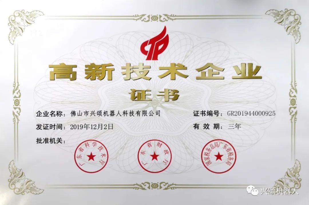 经全国高新技术企业认定管理工作领导小组办公室《关于广东省2019年第一批高新技术企业备案的复函》的批复,公布了广东省2019年第一批高新技术企业名单,兴颂机器人顺利通过评审,获得国家“高新技术企业”认证。