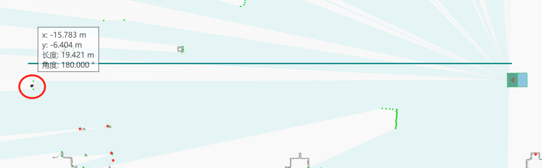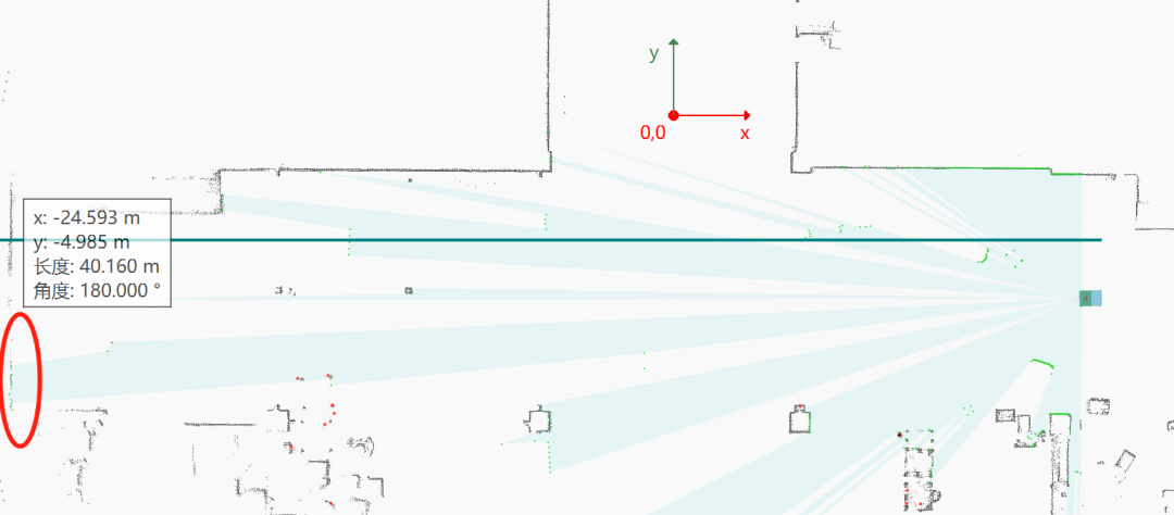 nanoScan3 标称的最远有效距离为40m,实际测试中距离机器人 40m 处的墙面可以明显获得正确的激光数据反馈,如下图: