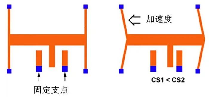 也就是说,在被测物倾斜时会产生的加速或减速,令MEMS传感部件中可移动部分向一侧移动,图示如下:
