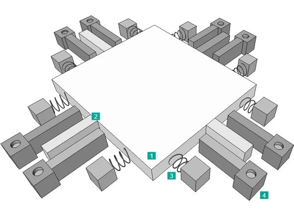 图 1:MEMS 传感器的原理(1、检测质量;2、电极;3、弹簧;4、固定电极)